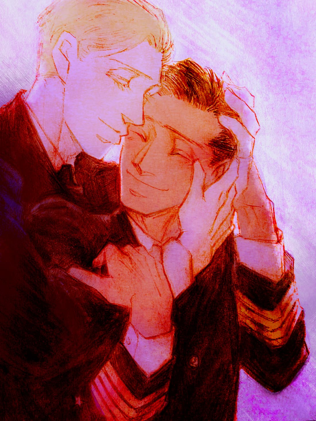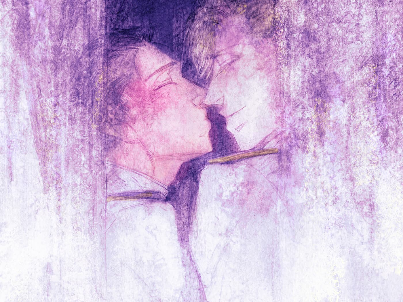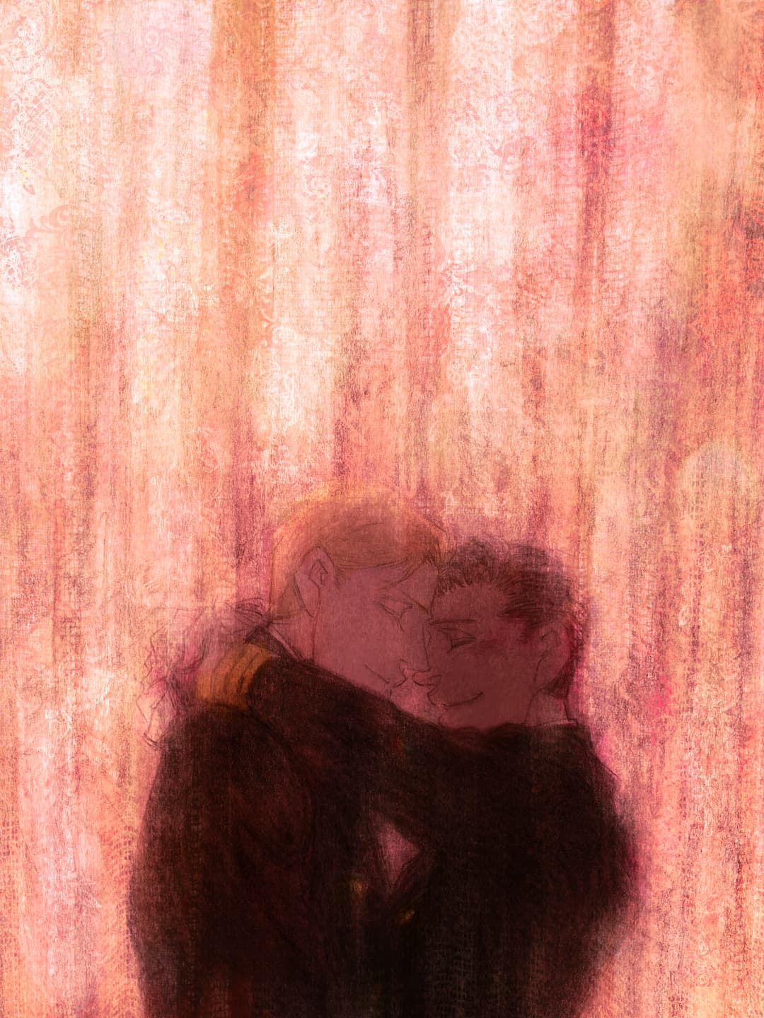 家にいるときは、ちょくちょくおでこゴツンしたりキスしたりしていてほしい…!最近は目を閉じてる二人の絵ばかりになってた。何か触覚や香り、音などの感覚に没入してほしい気分だったのかもしれない